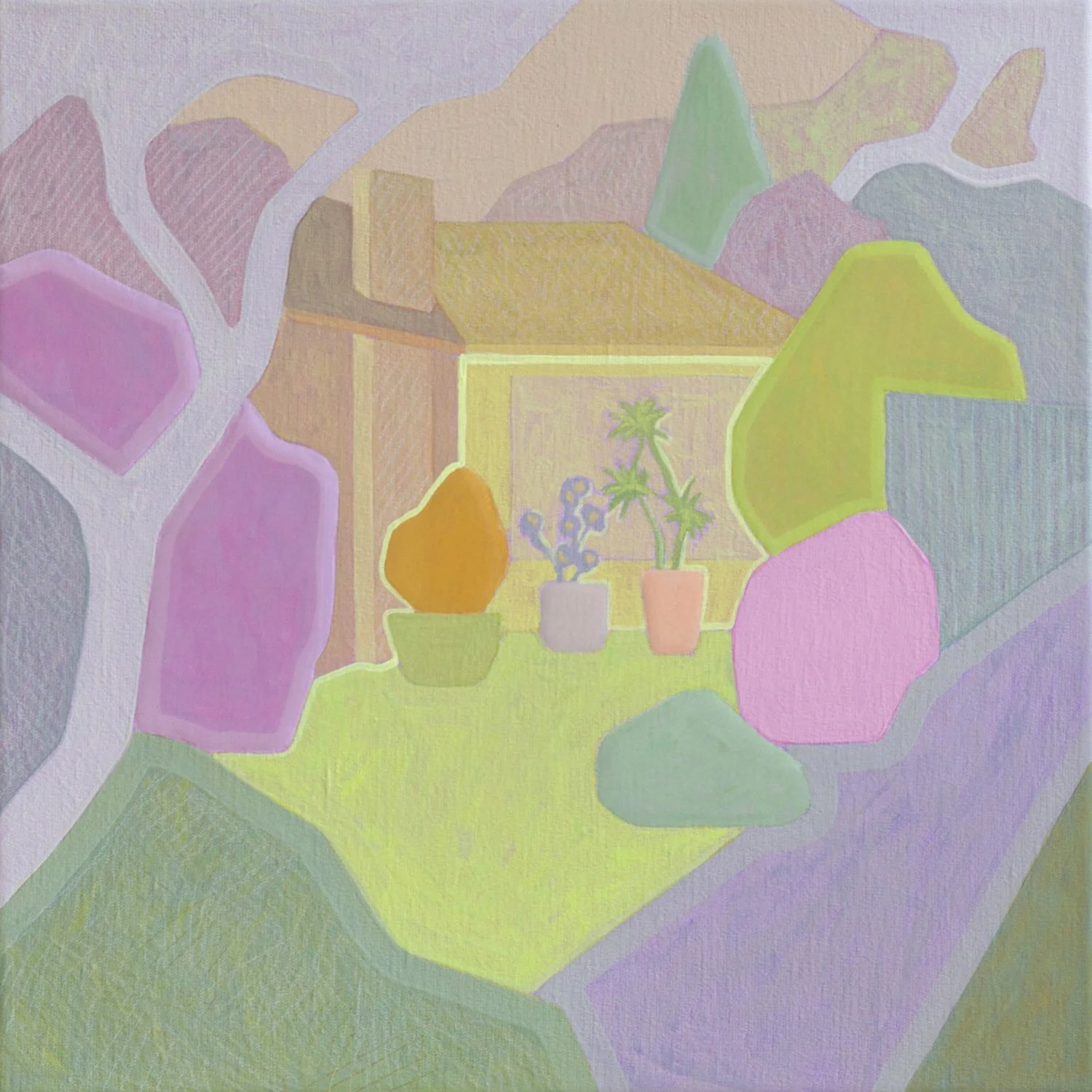 Sunlit House , 2026, 40cm x 40cm, Flashe (vinyl paint), Acrylic and Wax Pencil on Canvas